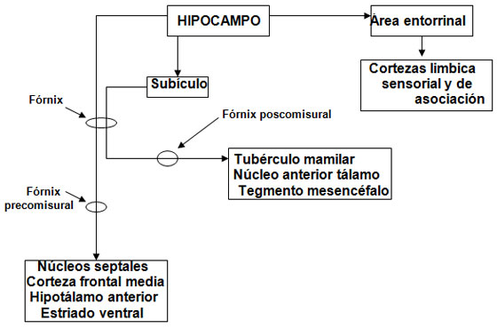 La formación del hipocampo envía muchas fibras muchas fibras directamente de vuelta a la corteza entorrinal y de allí a otras áreas corticales (límbica, sensorial y de asociación, pero su vía eferente más importante desde el punto de vista anatómico es el Trígono cerebral o Fórnix.